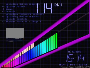 and it is the only one I've tested. -Limited error recovery. -Always starts with KM/H, and WinAmp in shuffle mode -External webcam image must be 'webcam.bmp' in the working folder and must be 160x120 pixels -Only tested on Windows XP - might work on 2000. Not likely to work on any other. -Font sizes, layouts, and colors are hard coded -Bitmap filenames are hard coded, but may be changed. The masks must be mono bitmaps, with