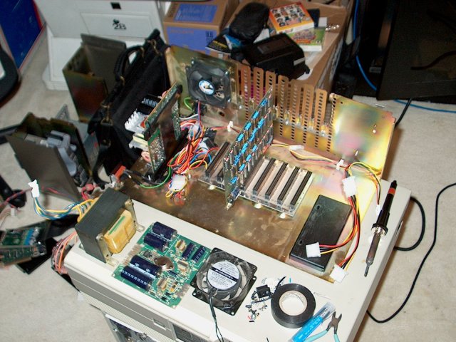 the way to the floppy bay. You can see, in front of the case, the old fan, power supply board, and transformer.