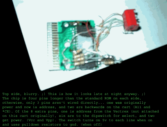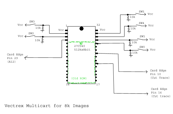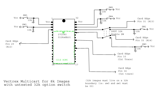 I've included a rough schematic for using a DPDT to enable 32k mode... it could be used to stick 32k games in the cartridge. It just replaces SW0 and SW1 with the appropriate address lines from the Vectrex. The caveat then is that 32k games must sit at a 32k offset, and all other games at an 8k offset. You'd also have to remember to flip the 32k switch to play a 32k game, but there are some nice ones (like Vecmania)... This is tested and works well. ;)
